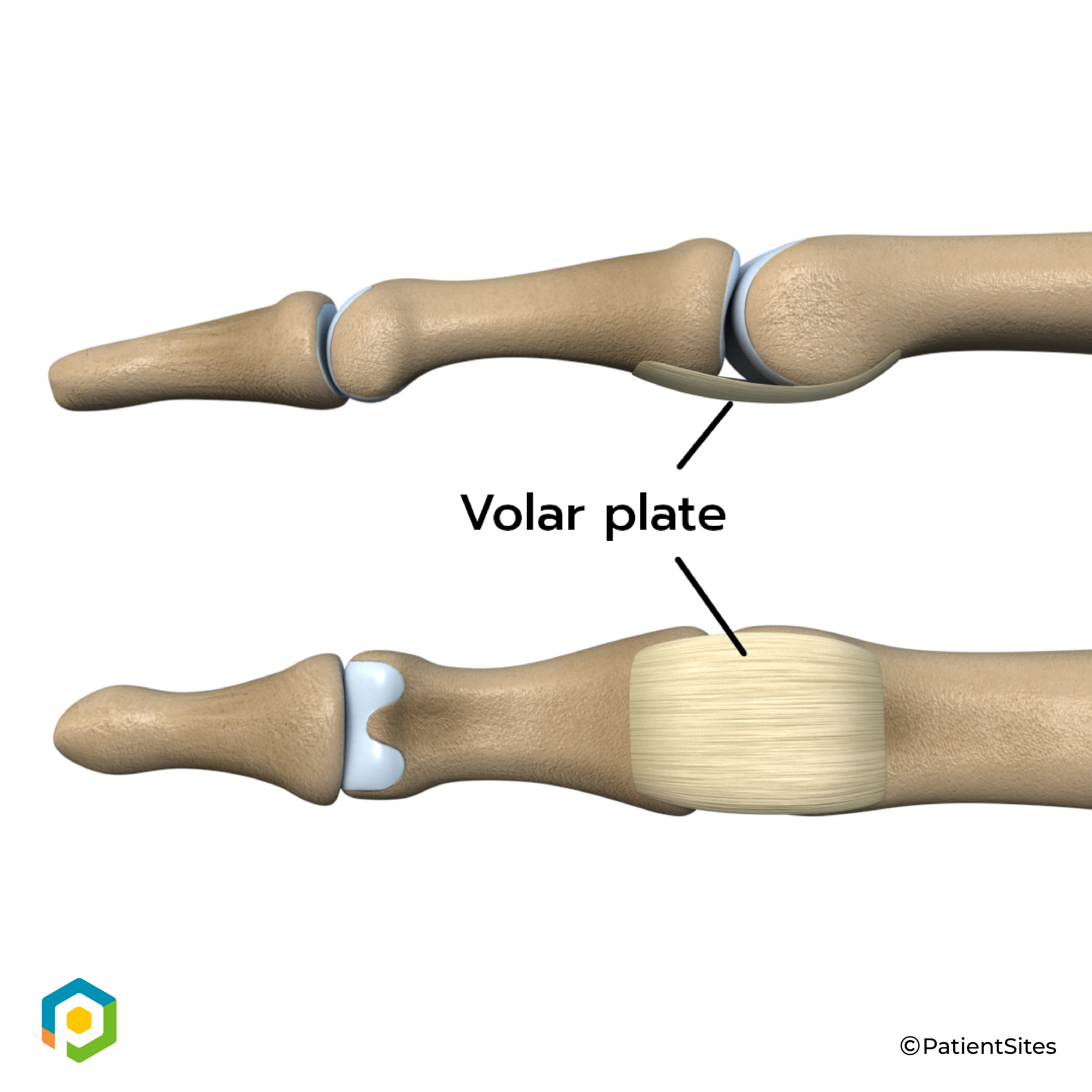The proximal IP joint (PIP joint) is the middle joint between the main knuckle and the DIP joint. (Proximal means closer in.) The IP joints of the fingers work like hinge joints when you bend and straighten your hand. The tendons that allow each finger joint to straighten are called the extensor tendons. The extensor tendons of the fingers begin as muscles that arise from the backside of the forearm bones. These muscles travel toward the hand, where they eventually connect to the extensor tendons before crossing over the back of the wrist joint. As they travel into the fingers, the extensor tendons become the extensor hood. The extensor hood flattens out to cover the top of the finger and sends out branches on each side that connect to the bones in the middle and end of the finger. When the extensor muscles contract, they tug on the extensor tendon and straighten the finger. Extensor HoodLigaments are tough bands of tissue that connect bones together. Several small ligaments connect the extensor hood with other tendons that travel into the finger to bend the finger. These connections help balance the motion of the finger so that all the joints of the finger work together, giving a smooth bending and straightening action. In the PIP joint (the middle joint between the main knuckle and the DIP joint), the strongest ligament is the volar plate. This ligament connects the proximal phalanx to the middle phalanx on the palm side of the joint. Volar PlateThe ligament tightens as the joint is straightened and keeps the PIP joint from bending back too far (hyperextending). Swan neck deformity can occur when the volar plate loosens from disease or injury. Related Document: Clarity Physical Therapy & Wellness Center's Guide to Hand Anatomy Hand Anatomy Introduction CausesHow does this condition occur? A swan neck deformity describes a finger with a hyperextended PIP joint and a flexed DIP joint. Conditions that loosen the PIP joint and allow it to hyperextend can produce a swan neck deformity of the finger. Rheumatoid arthritis (RA) is the most common disease affecting the PIP joint. Chronic inflammation of the PIP joint puts a stretch on the volar plate. (As mentioned earlier, the volar plate is a supportive ligament in front of the PIP joint that normally keeps the PIP joint from hyperextending.) As the volar plate becomes weakened and stretched, the PIP joint becomes loose and begins to easily bend back into hyperextension. The extensor tendon gets out of balance, which allows the DIP joint to get pulled downward into flexion. As the DIP joint flexes and the PIP joint hyperextends, the swan neck deformity occurs. Other conditions that weaken the volar plate can produce a swan neck deformity. The small (intrinsic) muscles of the hand and fingers can tighten up from hand trauma, RA, and various nerve disorders, such as cerebral palsy, Parkinson's disease, or stroke. The muscle imbalance tends to weaken the volar plate and pull the PIP joint into extension. Weakness in the volar plate can also occur from a finger injury that forces the PIP joint into hyperextension, stretching or rupturing the volar plate. As mentioned, looseness (laxity) in the volar plate can lead to a swan neck deformity. Related Document: Clarity Physical Therapy & Wellness Center's Guide to PIP Joint Injuries of the Finger